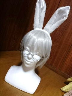 アリスの白兎イメージで白ウィッグにうさ耳と尻尾を装着。